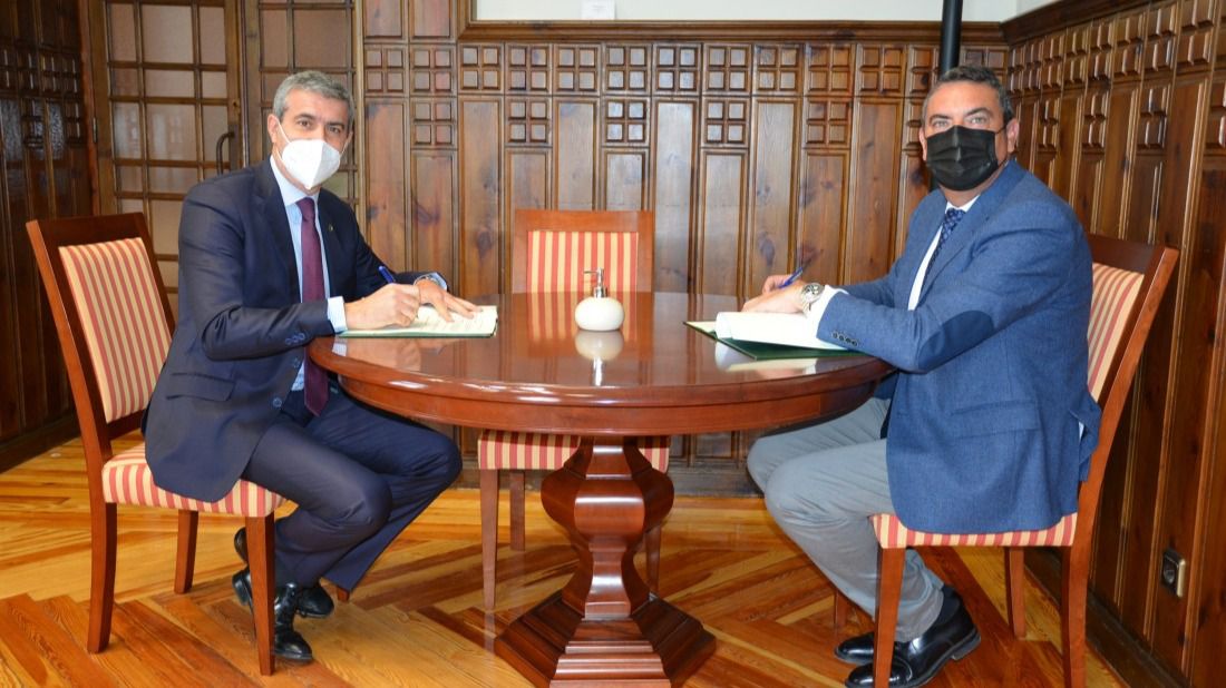 El presidente de la Diputación de Toledo, Álvaro Gutiérrez, y el presidente de la Agrupación de Empresarios de la Construcción y Afines de la provincia de Toledo “AECA Toledo”, Saturnino Gómez, han sellado un acuerdo de colaboración para facilitar la formación de aquellos trabajadores de la Institución que realicen oficios encuadrados dentro de las actividades del sector de la construcción.