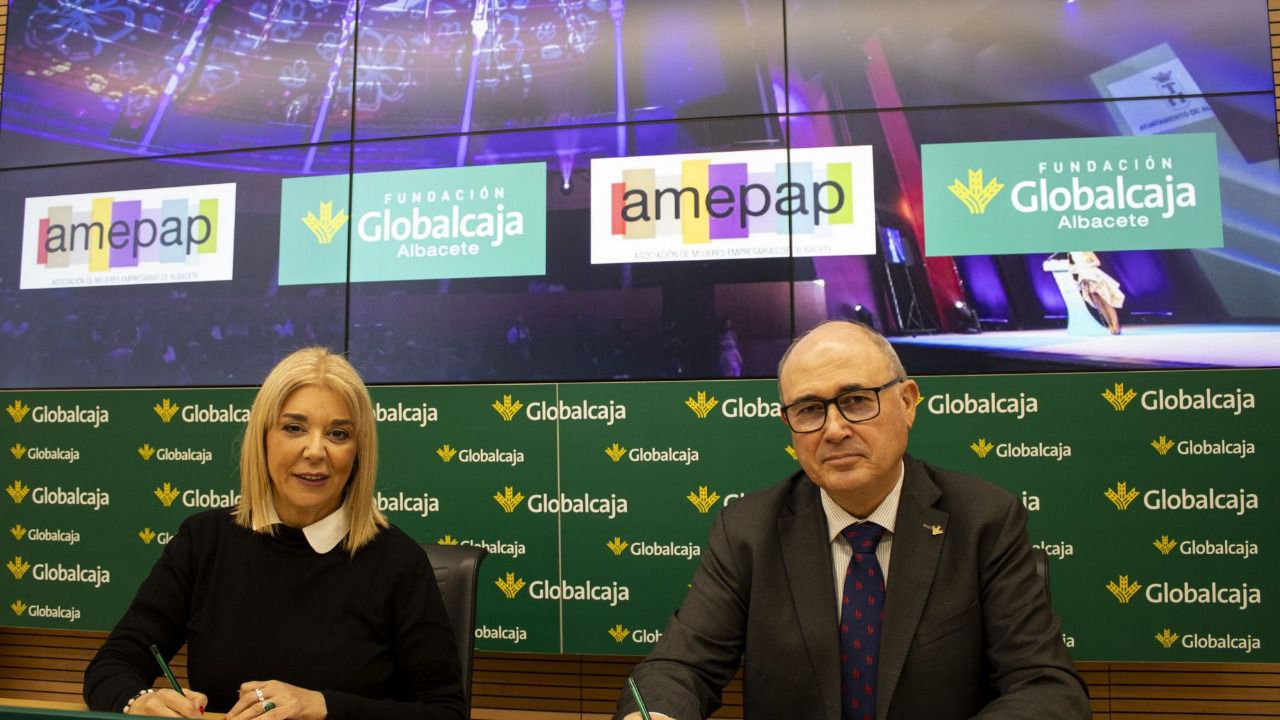 El presidente de la Fundación Globalcaja Albacete, Herminio Molina, y la presidenta de Amepap, Toñi Pastrana, han rubricado esta colaboración, que persigue respaldar la trayectoria de empresarias que son referentes y que destacan en distintos ámbitos, como son el mundo rural, la creación de empleo, el sector agroalimentario o el emprendimiento novel, entre otras categorías.