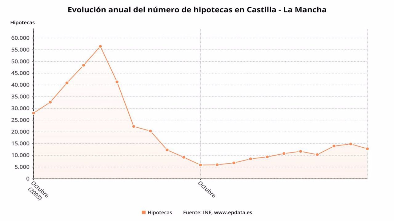 En Castilla-La Mancha se prestaron 125,55 millones de euros para la constitución de hipotecas sobre viviendas en octubre, un 1,9% más del capital prestado que hace un año. Comparado con el mes anterior, el capital prestado para constituir hipotecas subió un 0,24%