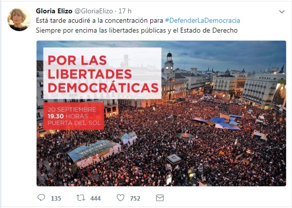 Por su parte, la diputada de Podemos por Toledo Gloria Elizo, anunció su presencia en la concentración de ayer por la tarde en la madrileña Puerta del Sol para “defender la democracia”.