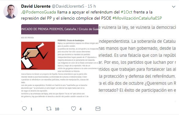 La llamada llega a través de su cuenta de Twitter, en la que reproduce el comunicado de Podemos Guadalajara, provincia por la que es diputado. Un comunicado en el que arremete duramente contra el Partido Popular y que finaliza con un ataque desmedido contra el PSOE y defendiendo el referéndum: “Ante el inmovilismo y las amenazas de Rajoy, ante los que dijeron ‘no es no’ pero ahora son comparsa del gobierno, hay que defender el derecho a decidir del pueblo catalán votando el 1 de octubre”.