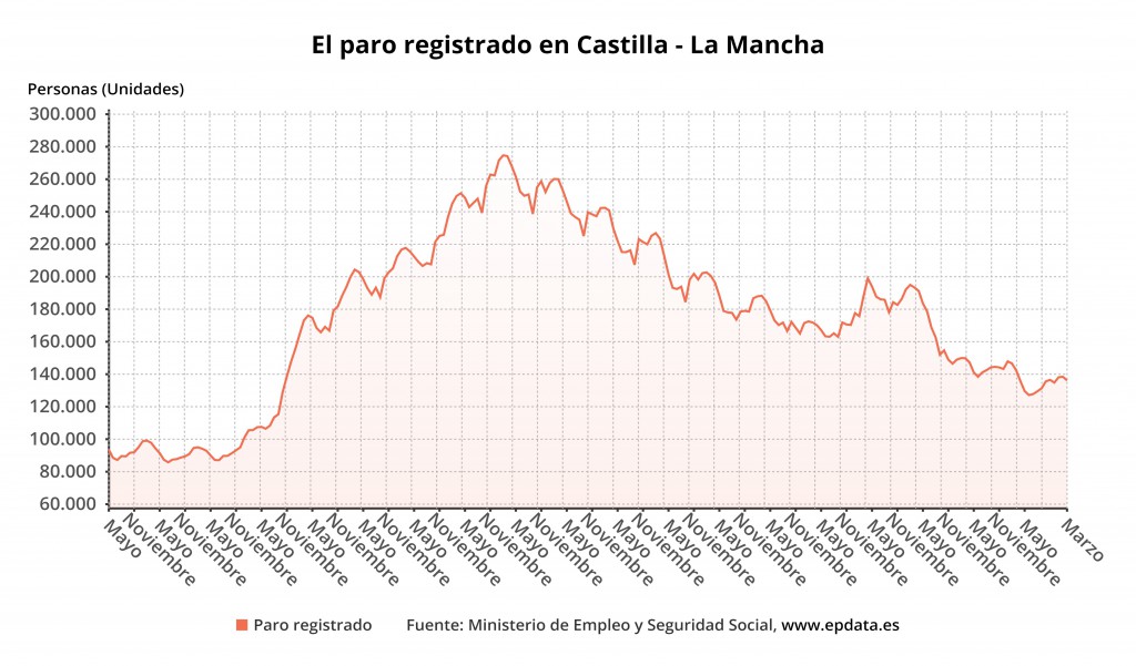 El paro registrado en las oficinas de los servicios públicos de empleo bajó en 2.312 personas en marzo en Castilla-La Mancha en relación al mes anterior (-1,67%) hasta las 136.162 personas desempleadas, según datos publicados por el Ministerio de Trabajo y Economía Social.