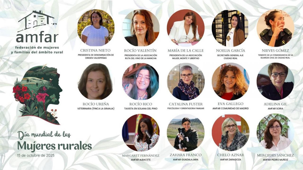 Completan el panel de mujeres rurales referentes Nieves Gómez López, Teniente de la Guardia Civil de Ciudad Real; María de la Calle, promotora de turismo rural; Rocío Valentín González, presidenta de la Asociación de la Ruta del Vino de Castilla-La Mancha y varias presidentas territoriales de Amfar, concretamente, Eva Gallego Berzal, presidenta de Amfar en la Comunidad de Madrid, Adelina Gil Rampérez, presidenta de Amfar Soria; Chelo Aznar Laborda, presidenta de Amfar de Aragón; Margaret Fernández-Bleda, presidenta de Amfar Albacete, Zahara Franco Clemente, presidenta de Amfar Guadalajara y Mercedes Sánchez- Cruzado, Presidenta de Amfar de Pedro Muñoz que hablarán del papel de las mujeres en sus territorios.