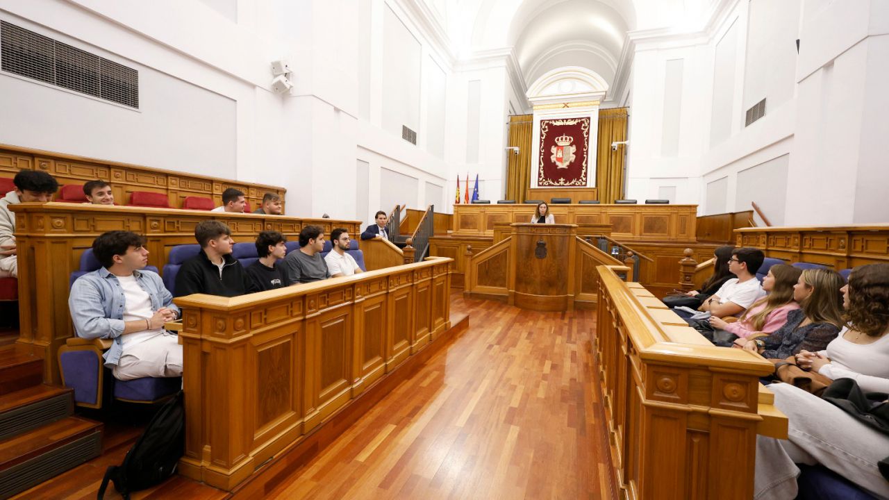 El programa que gestiona la Presidencia de las Cortes Regionales de Pablo Bellido permite a través de estas dos fórmulas conocer el edificio del parlamento. Una de estas posibilidades es concertar una visita para un grupo cerrado como escolares, universitarios o asociaciones. Fue el caso ayer lunes de un grupo de alumnado del doble Grado en Derecho y ADE de la Universidad de Castilla-La Mancha en Toledo, la primera visita guiada del nuevo curso. En lo que va de legislatura ha habido ya 132 visitas de este tipo.