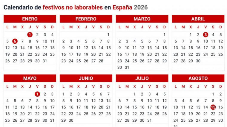 El calendario de 2026 permitirá disfrutar en todas las comunidades de al menos cuatro puentes o fines de semana largos: el del Viernes Santo (3 de abril), el de la Fiesta del Trabajo (1 de mayo), el de la Fiesta Nacional del 12 de octubre y el de Navidad, que caerá en viernes.