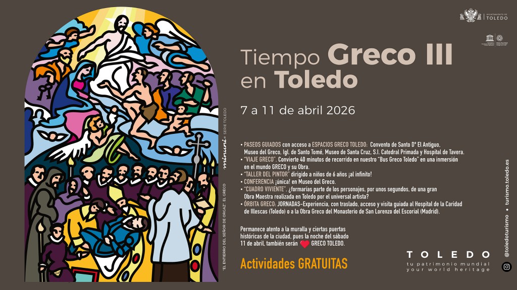 La actividad siempre se desarrolla en torno a la fecha del fallecimiento del artista, el 7 de abril de 1614 en Toledo “la única ciudad donde se pueden ver los Grecos en el lugar para el que fueron pintados”, y en ese sentido, ‘Tiempo Greco’ acoge una programación que busca acercar la obra del pintor tanto a visitantes como a toledanos, “ponemos en valor que Toledo es la ciudad del Greco, reforzando nuestra marca cultural en un lugar donde ninguna otra ciudad puede estar”, ha subrayado Velasco, destacando la relevancia internacional del artista.