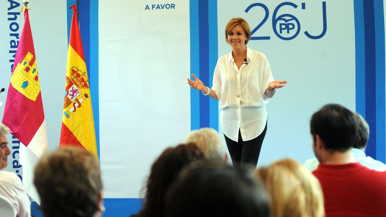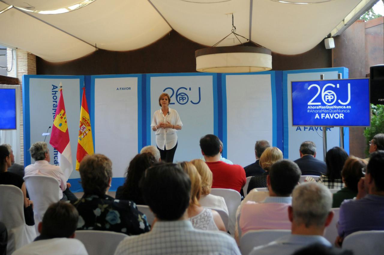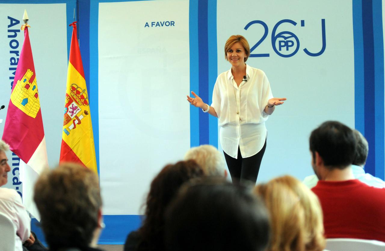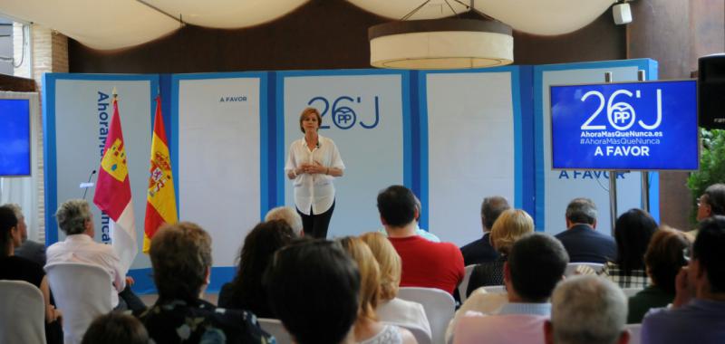 9, junio, 2016.- La presidenta del Partido Popular de Castilla-La Mancha y secretaria general de esta formación a nivel nacional, María Dolores Cospedal, ha asegurado que el PP ha demostrado que es el único partido capaz de crear empleo, bajar los impuestos y defender la unidad de España.